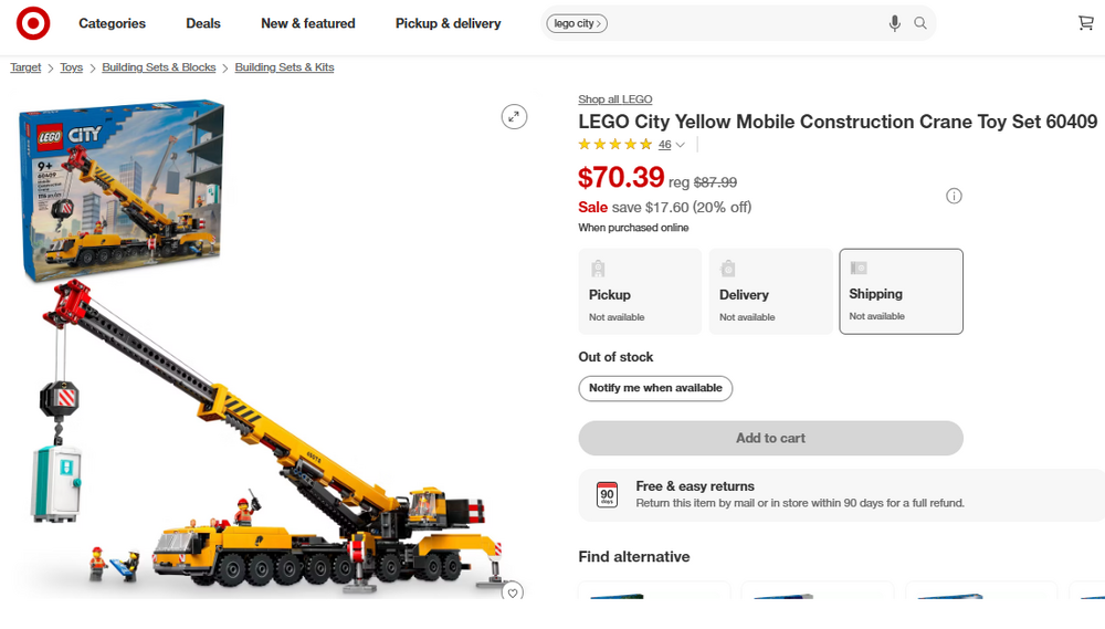 2. $40 off if you can find it in your local store... https://www.target.com/p/lego-city-yellow-mobile-construction-crane-toy-set-60409/-/A-90127308